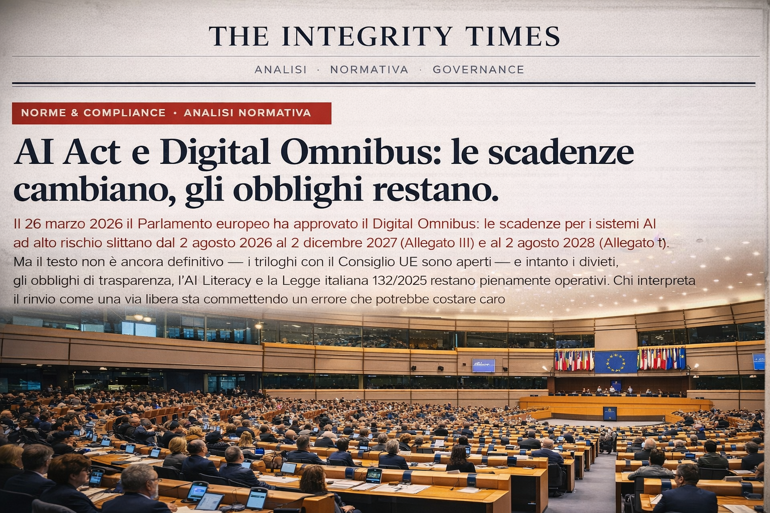 The Integrity Times · Norme & Compliance · Aprile 2026 · Fonti: GU UE L 2024/1689 del 12.07.2024 · Reg. (UE) 2024/1689 · Digital Omnibus COM(2025) 836 · PE 26 marzo 2026 · L. 23 settembre 2025, n. 132 · Commissione Europea · EUR-Lex · ISTAT